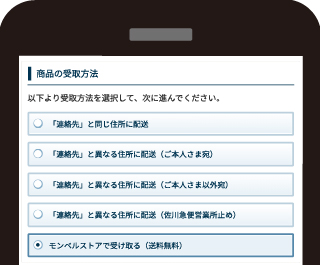 オンラインストアで、商品を買い物カゴに入れます。レジに進み、商品の受取方法で「モンベルストアで受け取る」を選択します。(PCでも同様の手順で選択できます。)