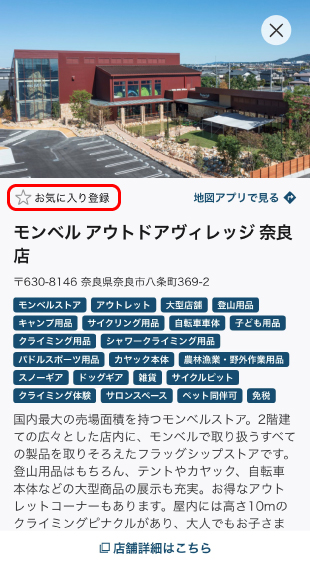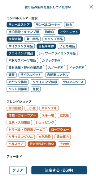 また、モンベルストアの他、モンベルが手がける宿泊施設や飲食店も探せるようになりました。