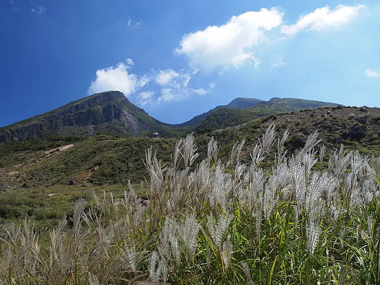 霧島錦江湾国立公園の北部に位置するえびの高原のエリア内では、火口湖を巡ることができ、約2時間で1周できるハイキングコースがあります。中でも六観音御池は、霧島の火口湖の中で最も美しく、コバルトブルーの湖面に映る韓国(からくに)岳と紅葉の様相はまさに絶景です。