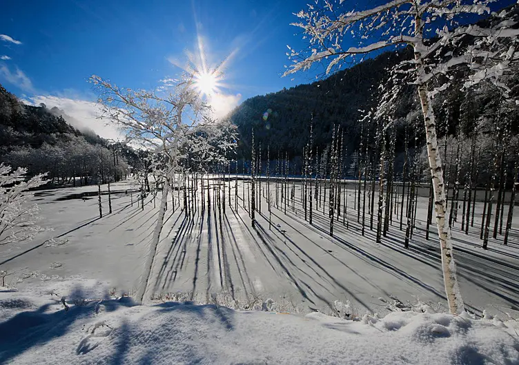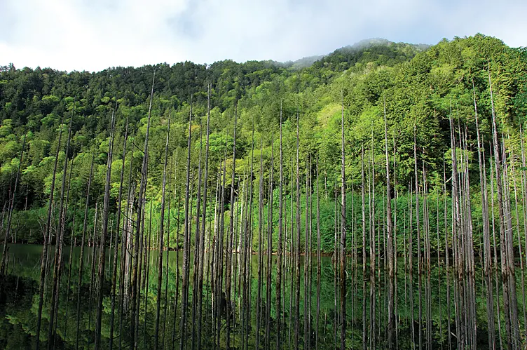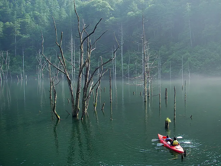 1984年の「長野県西部地震」によって王滝川の流れがせき止められて生まれた天然湖で、静かな湖面に立ち木が屹立し神秘的な情景を見せています。深い森と清流、湖面の立ち枯れの木々、湖畔の断崖の風情を、自然湖ネイチャーカヌーツアー で楽しめたり、四季を通じて写真撮影のスポットとして多くの人が訪れています。