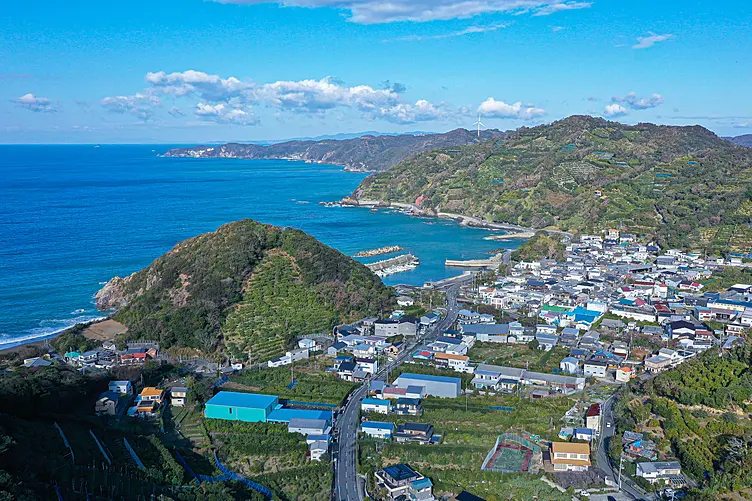 「有田みかん」の一大産地の湯浅町。まちをとりまく山の斜面に濃い緑のみかん畑と、海岸線のコントラストが美しい。