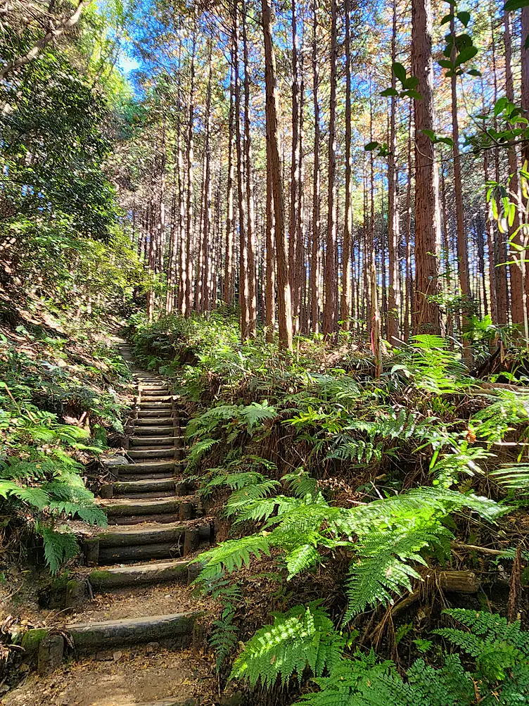 長岳寺の横から尾根道をたどり、奥の院を抜けていく長岳寺ルート。谷筋状や傾斜の急なところもありますが、多くの人が利用するコースです。古墳群や山城跡があり、歴史は古く、自然も豊かです。山頂からは、大和三山を含む奈良盆地、条件が整えば、明石海峡大橋まで見えます。