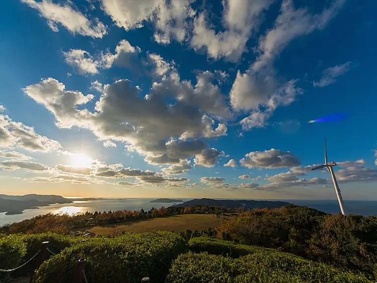 標高275mの頂上から、波静かな油谷湾と波濤の日本海が一望できる視界360度のパノラマ公園。島影に沈む夕日やダイヤモンドを散りばめたような眼下の漁火など、目に映る景観はひときわ印象的です。展望広場には東屋やベンチがあり、ピクニックや休憩にも最適。自然の中でのんびり過ごせる空間です。