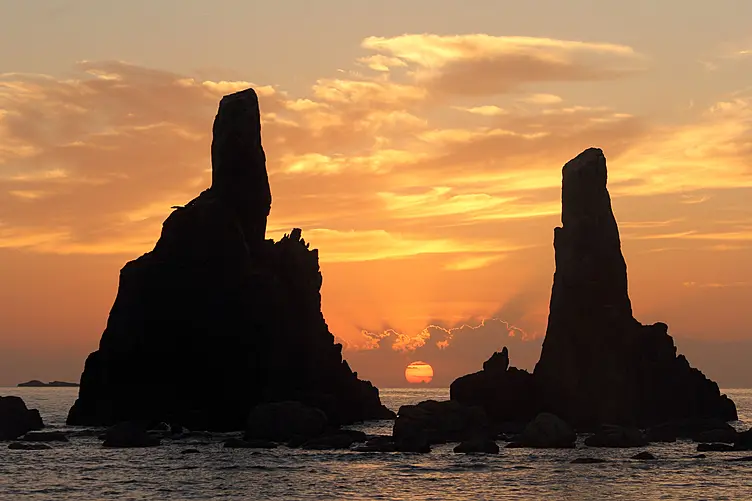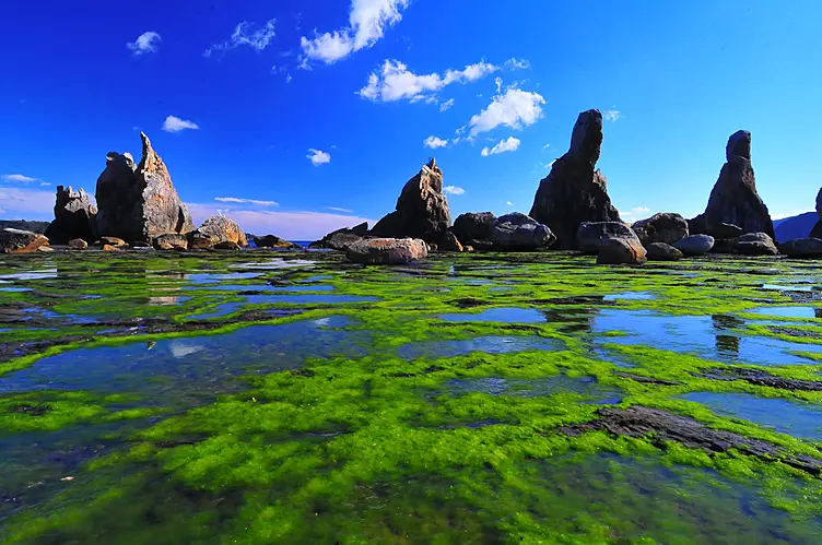 海中に約850mの列を成して大小40余りの岩柱がそそり立っています。海の浸食により岩の硬い部分だけが残り、あたかも橋の杭だけが立っているように見えるこの奇岩は、その規則的な並び方が橋の杭に似ていることから「橋杭岩」の名が付きました。